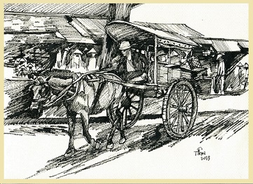 cứ rung lên theo nhịp lắc lư của chiếc xe, thỉnh thoảng, nẩy lên rồi rơi mạnh xuống đập vào cái bàn đạp dành cho khách lên xuống xe, bởi những cú xóc trên những ổ gà trũng sâu được tạo nên từ đầu mùa đông. Trên càng xe, lão già đánh xe ngồi tư lự, mắt hướng về phía mặt trời sắp lặn.
