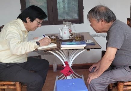 Đynh Trầm Ca chăm chú nhìn từng chữ Phương Tấn đang viết, ký tặng Đynh Trầm Ca 3 tác phẩm của Phương Tấn (trước một ngày Đynh Trầm Ca bị đột quỵ, cấp cứu tại bệnh viện).