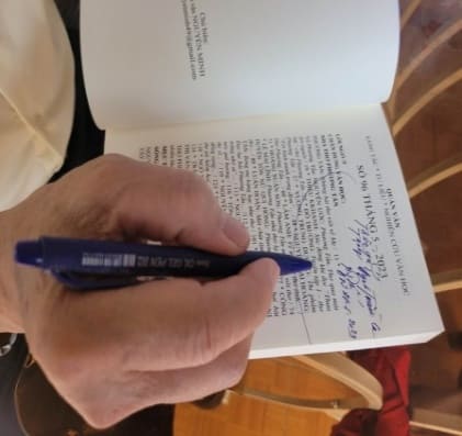 HÌNH 3. Phương Tấn ký tặng Đynh Trầm Ca tập san QUÁN VĂN số 96, Chuyên đề - “CHÂN DUNG VĂN HỌC PHƯƠNG TẤN” (trước một ngày Đynh Trầm Ca bị đột quỵ, cấp cứu tại bệnh viện). .